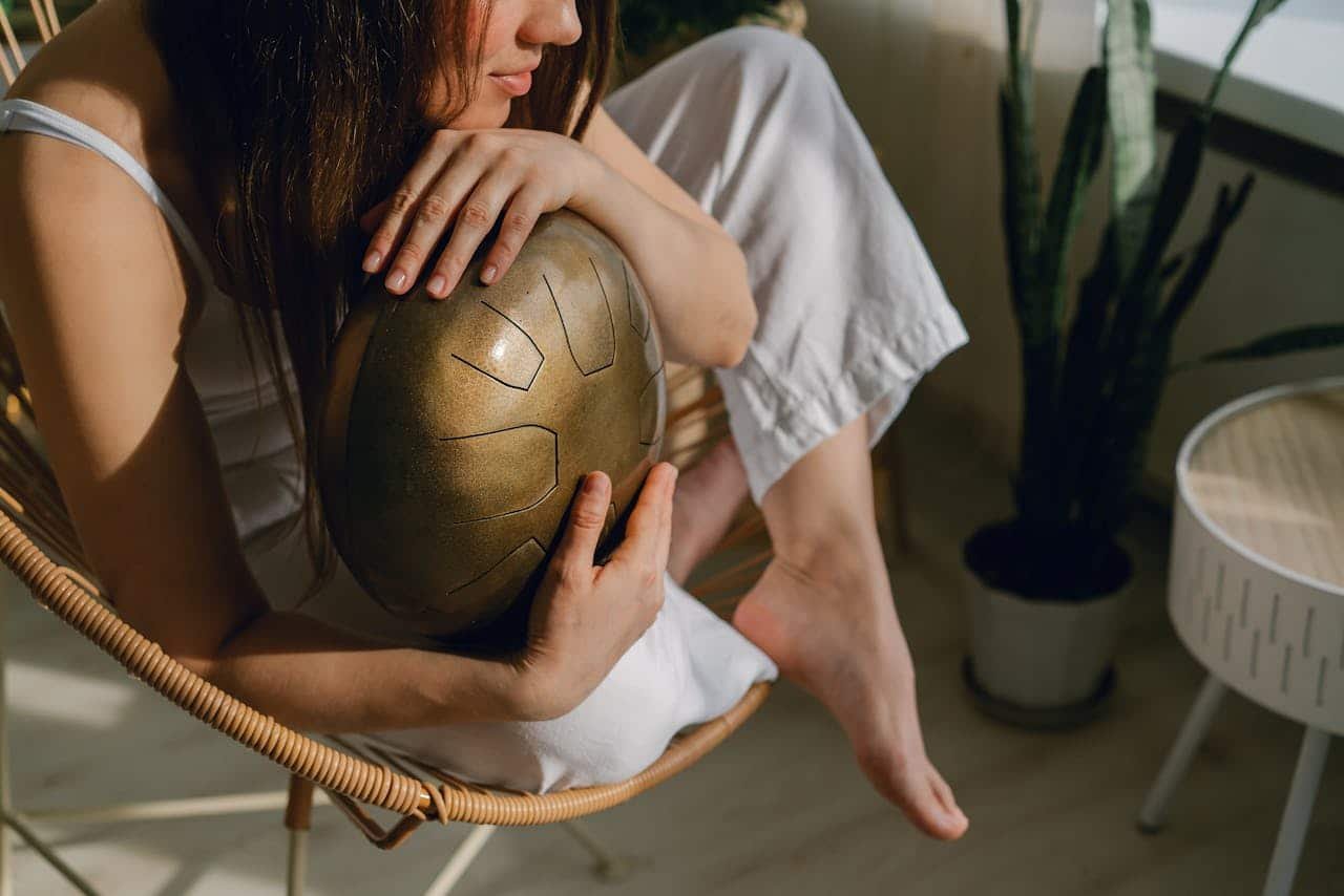 Un tongue drum sert de compagnon sonore pour synchroniser souffle et mouvements. Les notes régulières aident à ralentir le cœur et à passer des ondes Beta aux ondes Alpha, favorisant un état plus détendu.